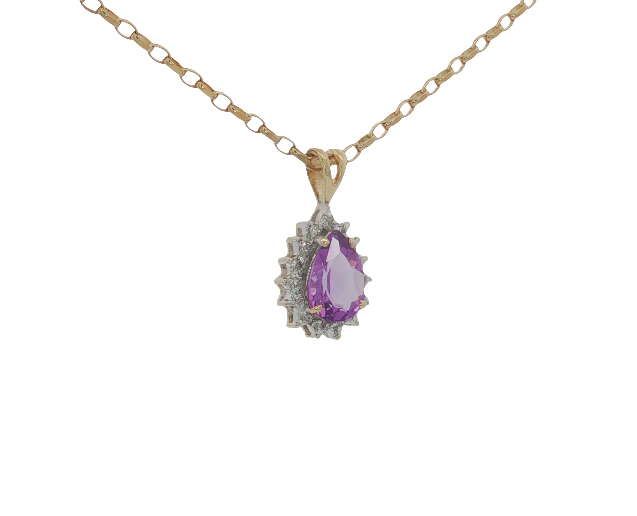 Hung from 9ct yellow oval belcher chain is a pretty, pear cut amethyst pendant, with small diamonds that compliment it.