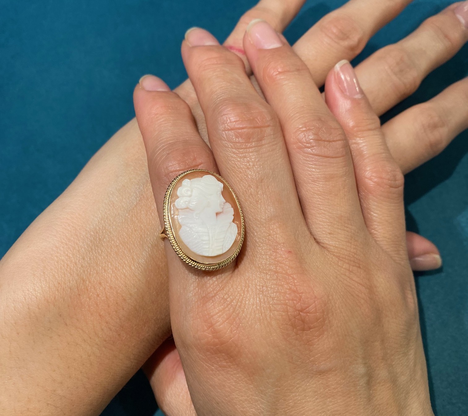 This beautiful ring, crafted in 9ct yellow gold exhibits a large detailed shell cameo of a pretty lady in Georgian attire.