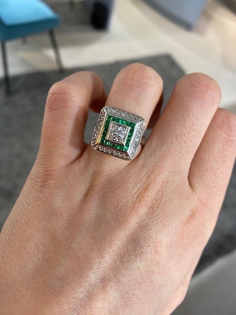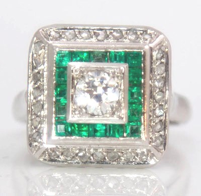 This attractive dress ring features a central round brilliant cut diamond, with a surround of calibre cut emeralds, and another row of round brilliant cut diamonds surrounding that. Straight shank with simple under-bezel. The ring is square set, made entirely of platinum, and high set in the 1930’s style.