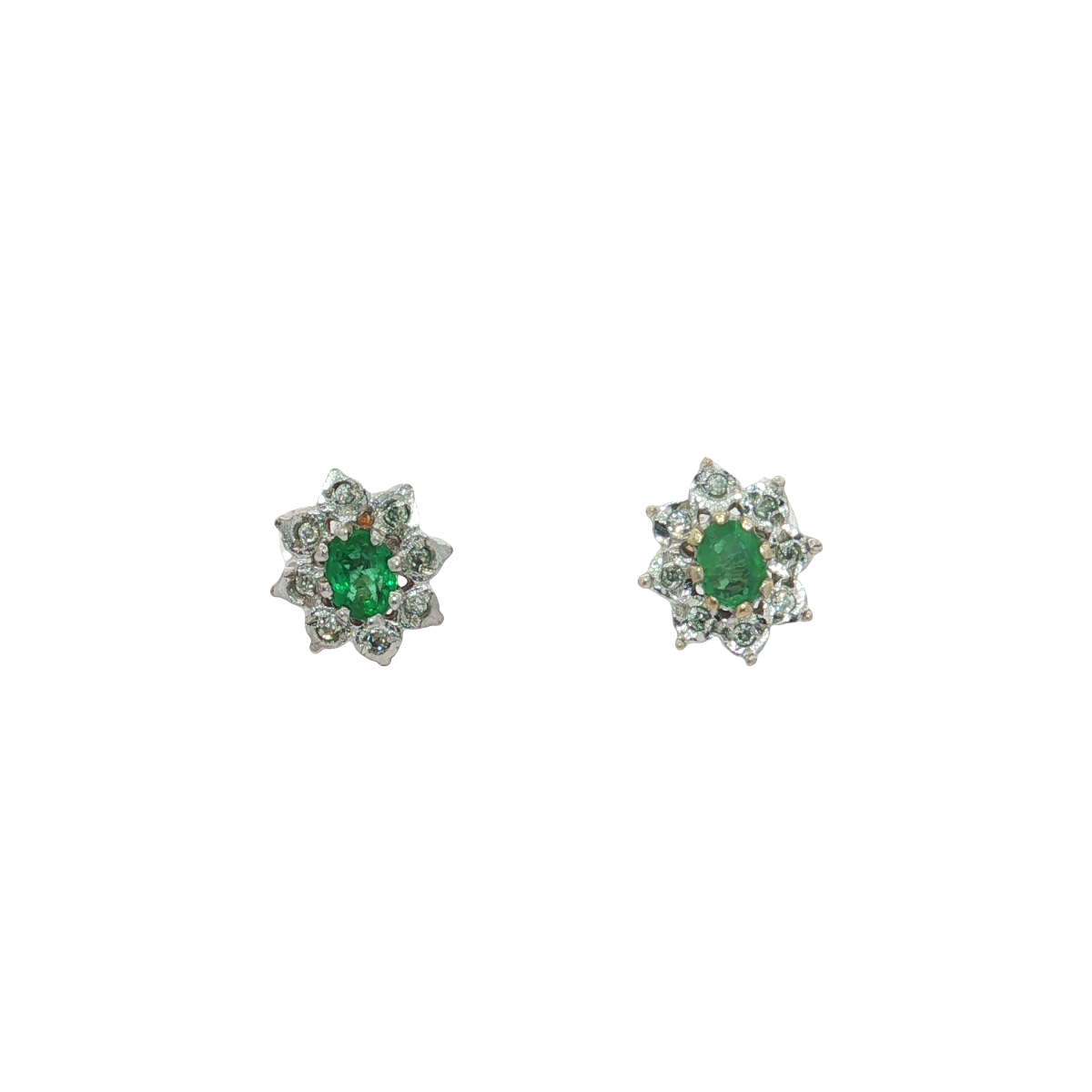 Elegant and pretty, these earrings show off a forest green emerald at the center, surrounded by a halo of 8 modern round brilliant diamonds. set in 9ct yellow and white gold.