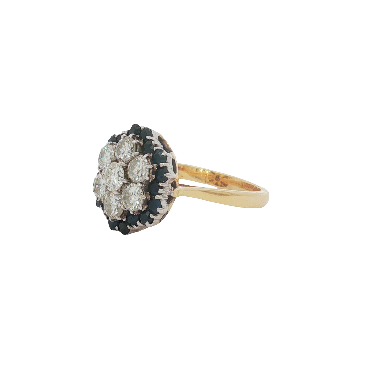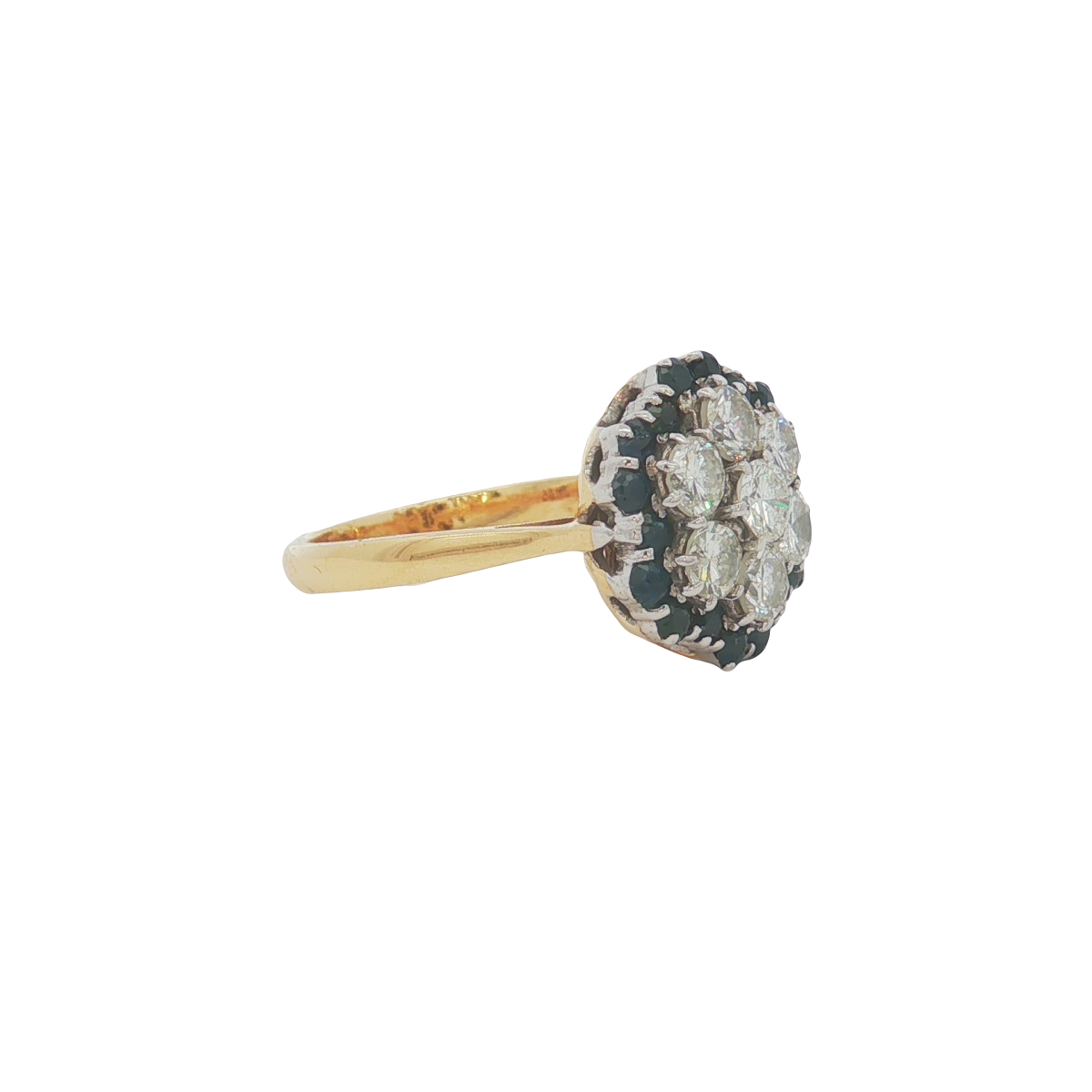 This stunning ring is crafted in a rich 18ct yellow gold, showing off a cluster of Sapphires and Diamonds resembling a flower. the estimated total weight of the Diamonds are 1.05ct.
