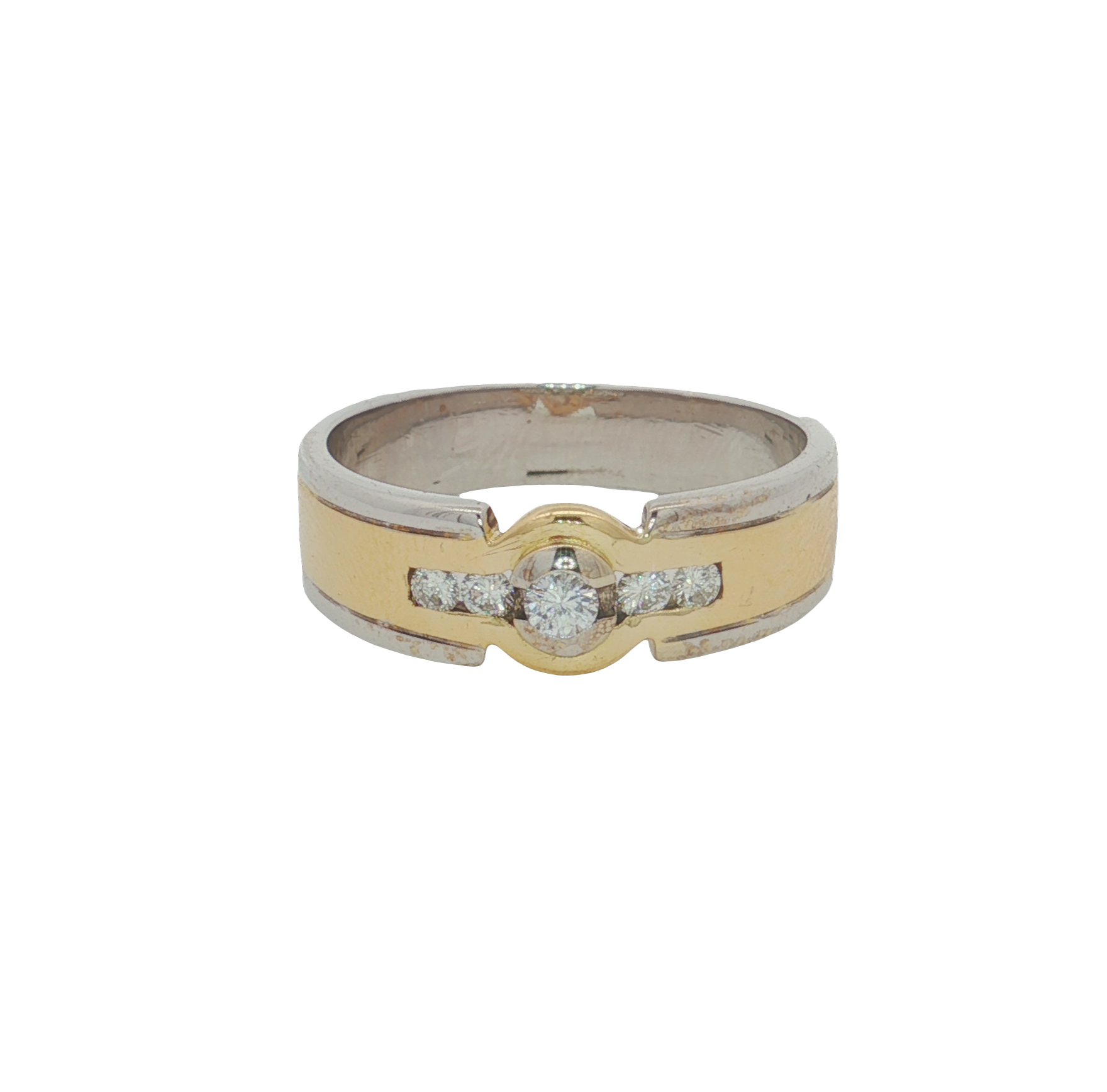 This sophisticated band styled ring features five diamonds, and is crafted from 18ct white and yellow gold.